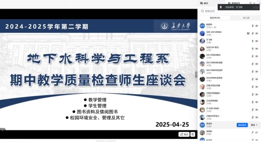 为进一步提升教学质量,深入了解学生在学习与生活中的实际需求,水利与环境学院地下水科学与工程系于4月25日通过线上会议形式召开了2024-2025学年第二学期期中教学质量检查师生座谈会。学院副院长李培月、地下水系主任陈洁、地下水系教师代表及本科四个年级的学生代表共计30余人参加本次会议。会议由地下水系副主任陆彦玮主持。